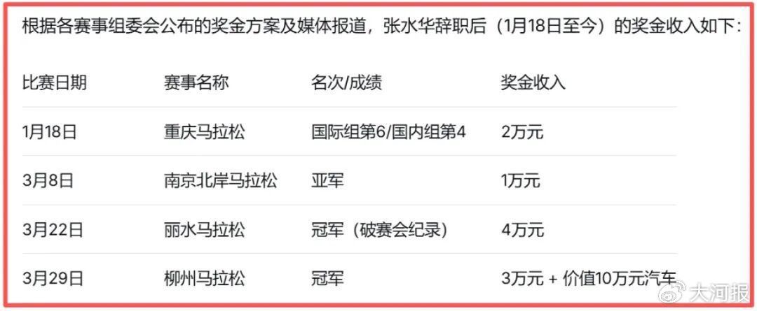 3月22日,丽水马拉松。这是张水华辞职后的首个冠军,她跑出2小时35分49秒,不仅夺得女子组冠军,还打破了赛会纪录。收获4万元奖金(1万冠军奖+3万破纪录奖)。